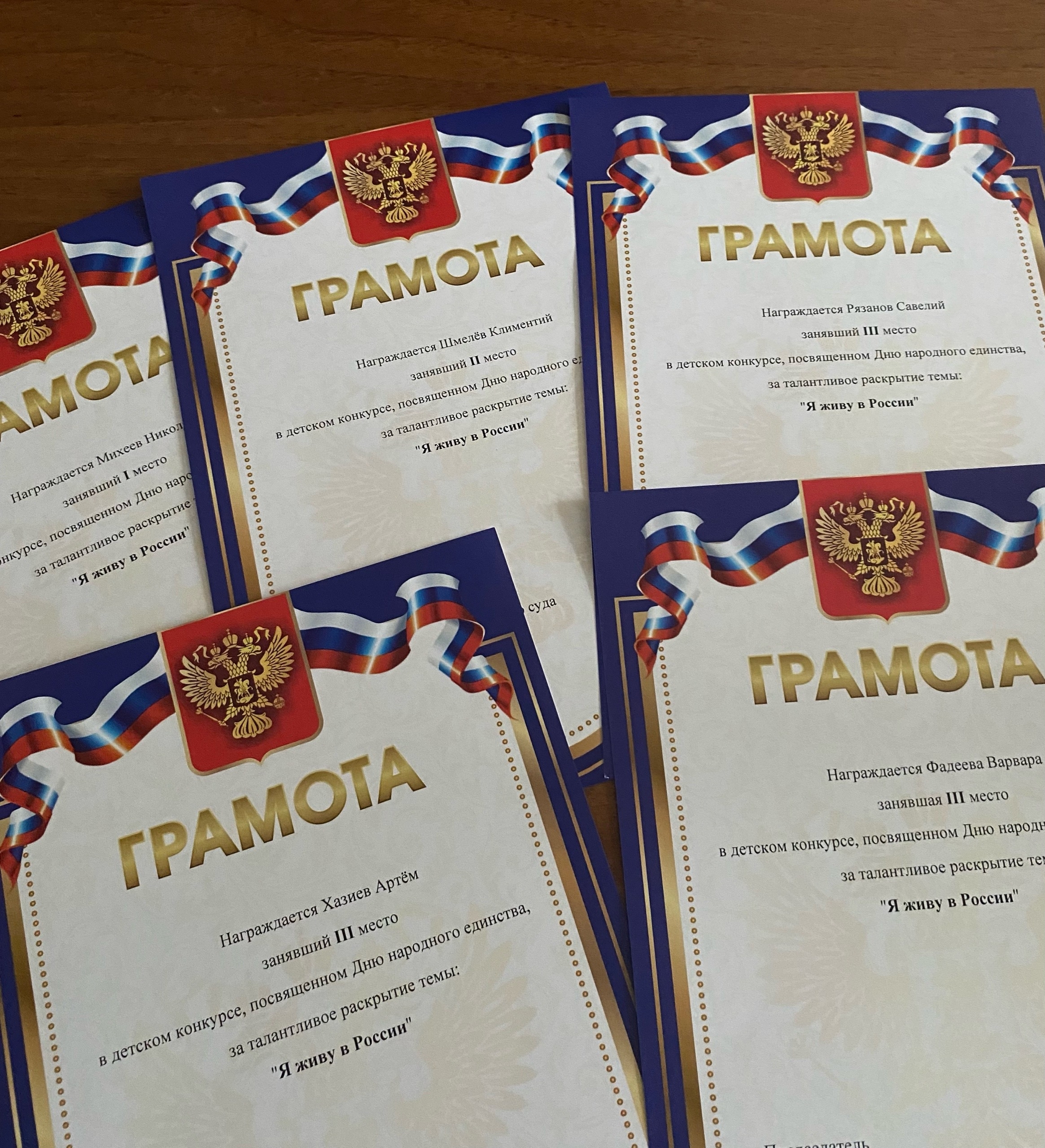 В Осташковском межрайонном суде ко Дню народного единства, между детьми сотрудников аппарата суда, прошел конкурс на тему: «Я живу в России». Ребята творчески и креативно проявили себя, за что были награждены грамотами, а победитель получил памятный подарок.
